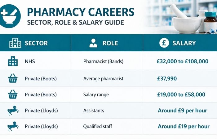 Senior NHS roles, especially Band 8 and 9. They can go above £100,000. In community pharmacy, salaries at Boots often start near £42,000. Overall, pharmacist pay in the UK stays stable and grows with experience and responsibility.