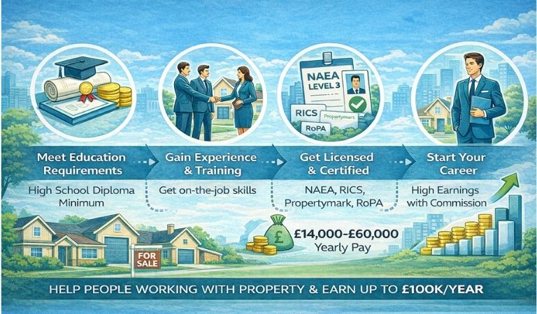 In the UK, you need at least a high school diploma. Also, studying business, property management, or estate development can help you get ahead. Many agents hold licences or certificates such as NAEA, Propertymark, RICS, or RoPA to stand out. Beginners usually earn £14,000 to £25,000. With experience, earnings rise to £25,000 to £60,000. Top managers can earn up to £100,000 plus a 1–3.5 per cent commission. To start, see if this career is right for you. Next, complete 3–4 months of training and get hands-on experience through an apprenticeship. After that, get your licence and start your career by joining a firm or opening your own agency.