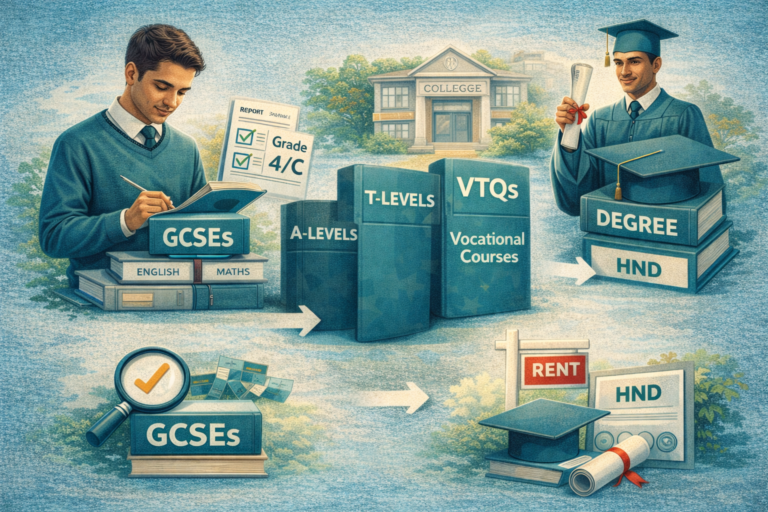 The education and qualifications you need depend on the job you want. Most roles start with GCSEs in English and Maths (Grade 4/C or above). Next, higher-level courses like A-levels, T Levels, or vocational courses (VTQs) can help you move forward. Some jobs may also need a bachelor’s degree or a Higher National Diploma (HND).