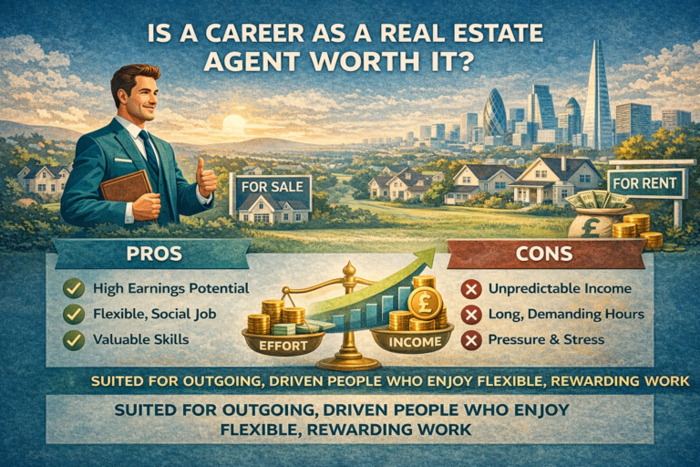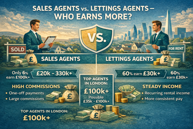 In London, agents can earn a lot. Experienced agents usually make around £50,000–£100,000+ per year. Top performers in luxury areas can go above £100,000. Also, sales often pay more than lettings, but lettings give a steady monthly income. Working in London is busy and fast, but hard-working agents can earn well.