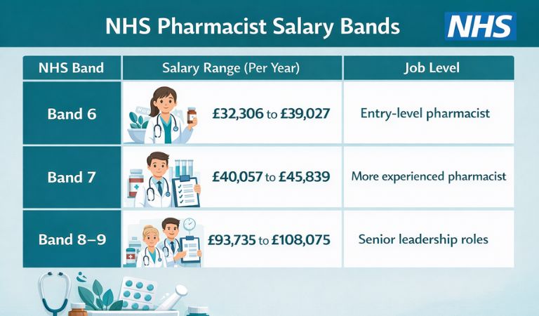 The NHS pharmacist salary follows a clear band system. Each band shows different pay levels and job responsibility. As pharmacists move up, both salary and duties increase.