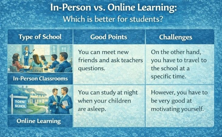 Choosing the right school is a big decision for your learning journey. Because of this, you should think about how you like to study and how much time you have. Both options have good things and bad things to consider.